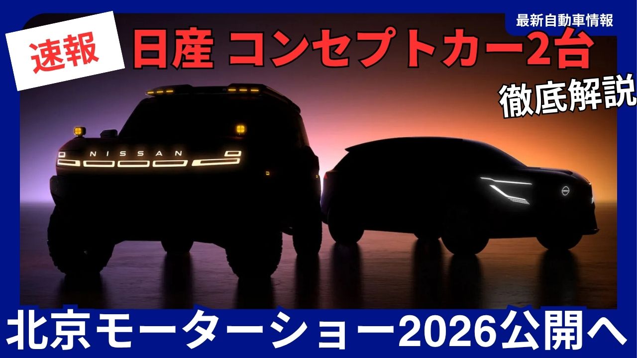 日産自動車は2026年4月20日、同月24日に中国・北京で開幕する「北京モーターショー2026(Auto China 2026)」において発表予定の新型コンセプトカー2台のシルエット画像を公式Webサイトおよび公式SNSで公開した。いずれも中国のNEV(新エネルギー車:BEV・PHEV・FCVを含む)市場を強く意識したモデルとされており、日産が推進する電動化・知能化戦略の新たなマイルストーンと位置づけられている。