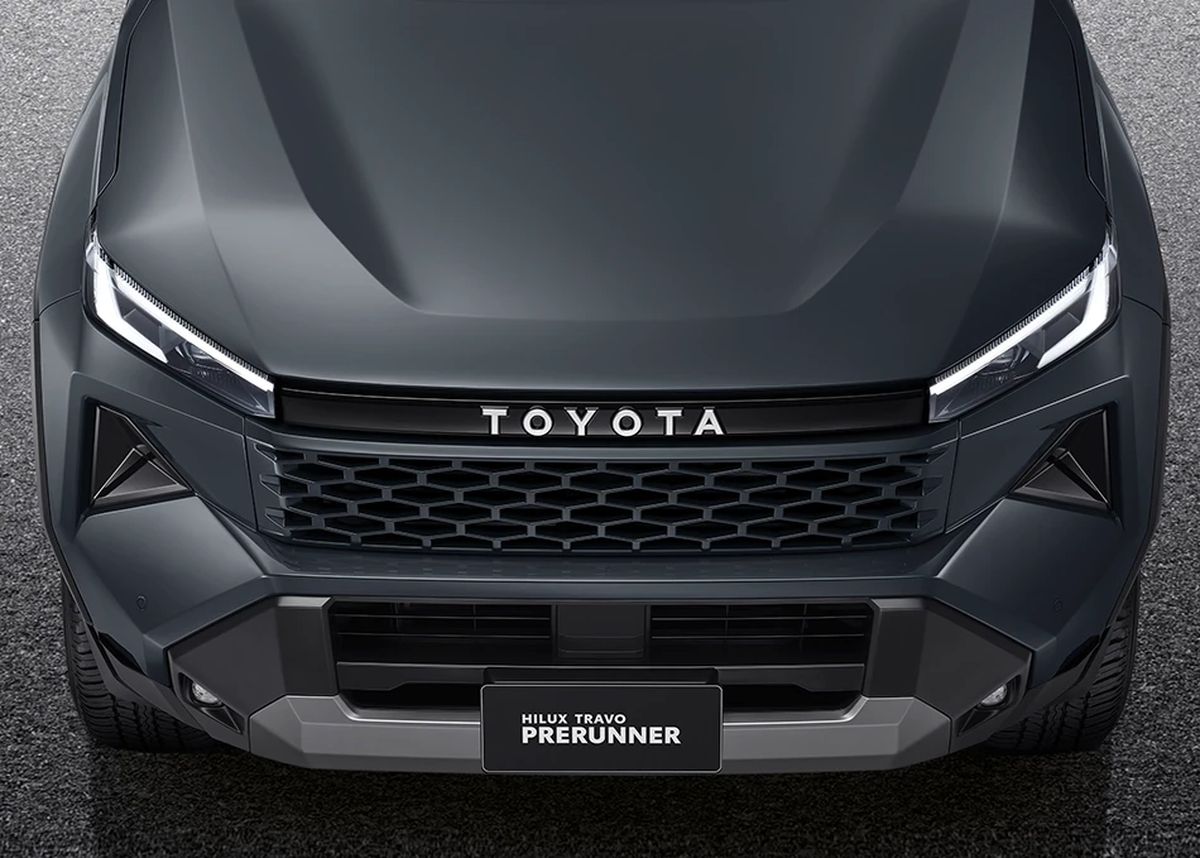 新型ハイラックスのフロントマスクは、新型カローラクロスやクラウンエステートのようなボディ同色グリルを採用。その上部には「TOYOTA」のレタリングバッジが配され、ヘッドライト意匠は"コ"の字型LEDデイタイムランニングライトを採用しています。